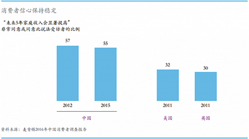 2015年調(diào)查數(shù)據(jù)顯示,55%的家庭認(rèn)為未來五年家庭收入將會顯著提高,而英國和美國在2011年時的數(shù)據(jù)僅為32%和30%。