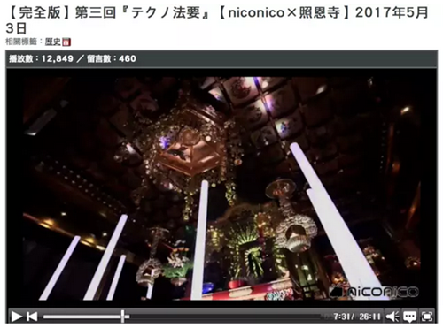 這是日本福井市照恩寺的一場超度儀式,跟以往莊嚴(yán)肅穆的宗教儀式相比,這場電音法會(huì)顯得極“不正經(jīng)”。除了用電子音樂誦經(jīng)、3D全息技術(shù)投影、五光十色的照明之外,這場法會(huì)還在日本彈幕網(wǎng)站鼻祖 niconico 上進(jìn)行了直播,引來 1.9 萬人觀看。