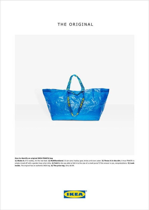 今年4月,巴黎世家推出新款購物托特袋,售價2145美元。而這件價格不菲的托特袋正是宜家售價4塊5人民幣的Frakta購物袋的翻版。