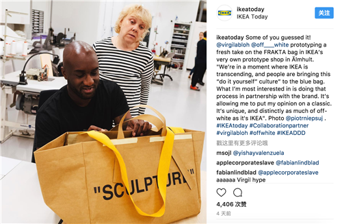 宜家宣布合作的同時,還在其官方ins上面貼出了 Off-White 創(chuàng)始人兼創(chuàng)意總監(jiān) Virgil Abloh 設(shè)計的聯(lián)名 FRAKTA 購物袋,包的一側(cè)還寫著“sculpture”。