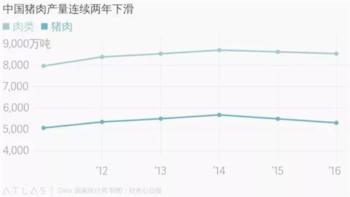 一直以來(lái),中國(guó)都是肉類消費(fèi)大國(guó)。按照美國(guó)農(nóng)業(yè)部的估計(jì),中國(guó)消費(fèi)者今年所食用的豬肉、牛肉和雞肉加起來(lái)會(huì)是美國(guó)消費(fèi)者的兩倍。不過(guò),國(guó)家統(tǒng)計(jì)局的數(shù)據(jù)顯示,2015 年開(kāi)始,中國(guó)肉類消費(fèi)有所下降。去年,國(guó)內(nèi)肉類產(chǎn)量同比下降了 1%,而占比最高的豬肉產(chǎn)量同比減少了 3.4%。