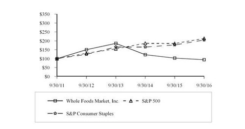 對(duì)于這般業(yè)績(jī),股東們顯然也是不太滿意,最直接的表現(xiàn)是13年之后,全食的股價(jià)再也沒(méi)能跑贏大盤(pán),且一路走低。