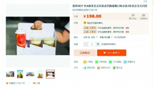 北京市場已有淘寶商家專門做起喜茶代購的服務(wù)。北京商報記者在一家提供喜茶代購服務(wù)的網(wǎng)店中注意到,代購一杯喜茶的跑腿費(fèi)用報價為66元,3杯起送,即一次代購產(chǎn)生的跑腿費(fèi)用至少為198元。