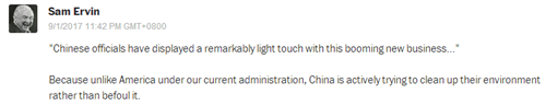 網(wǎng)友Sam Ervin:“‘中國官員對蓬勃發(fā)展的共享單車業(yè)務表現(xiàn)出柔性的監(jiān)管姿態(tài)?!绹灰粯?,中國正在積極地改善環(huán)境,而不是破壞環(huán)境?!?/font>