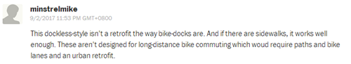 網(wǎng)友minstrelmike:“無樁式共享單車不適合遠距離的騎行者,解決這個問題還得靠自行車道的規(guī)劃和城市的改造?!?/font>