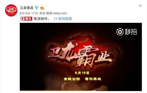6月14日消息,衛(wèi)龍辣條也要跨界出手游了。衛(wèi)龍食品官微曝光了一則預告短片,表示將于6月15日公測一款名叫《衛(wèi)龍霸業(yè)》的手游。