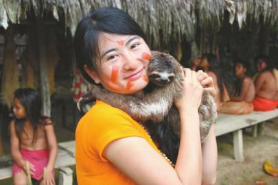 鄧深很喜歡小動物,這是她在旅行中和樹懶的合影。