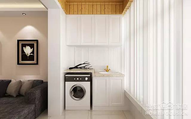 為了避免洗衣機影響整體簡約的美感,把洗衣機組合柜設置在落地窗封閉式陽臺的一側角落里,戶主將這個角落打造成了一個簡單又實用的空間,洗衣機左側是洗手池,上方有柜子,可以用來放置洗衣粉等用品,洗衣機上方的綠色植物又可以起到點綴作用,柔化了洗衣機的生硬形象。