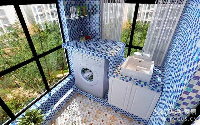 這一款讓人眼前一亮的陽臺放洗衣機效果圖便是地中海風格陽臺,戶主大膽采用藍白相間的馬賽克墻面,配合白色的洗衣機組合柜和洗手池,給人一種置身海邊的感覺。由于陽臺兩面都是落地窗,戶主便在轉角的墻面上設了一個置物架,用來放洗手液、洗衣液、洗面奶等用品,使用起來十分方便。