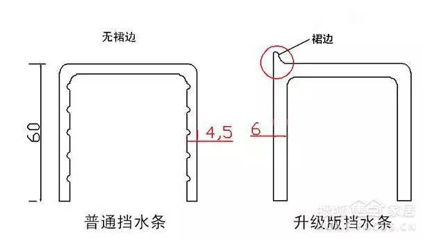 有些賣家吹噓有裙邊的擋水條有多好,實(shí)際上是誤導(dǎo)消費(fèi)者。有裙邊的擋水條實(shí)際上是用在帶玻璃的淋浴房下面做石基用的,玻璃是放在擋水條中間的,裙邊是防止水從玻璃下滲入擋水條。