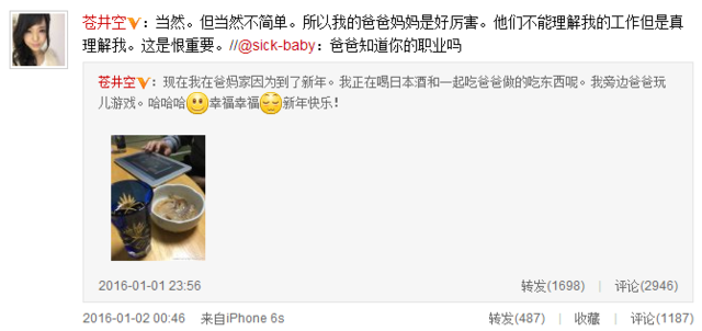 隨后有網(wǎng)友留言,問(wèn)及“你爸爸知道你職業(yè)嗎?”蒼井空很是坦誠(chéng)回答:“當(dāng)然。但當(dāng)然不簡(jiǎn)單。所以我的爸爸媽媽是好厲害。他們不能理解我的工作但是真理解我。這是很重要。”更有網(wǎng)友敏感地問(wèn)道:“蒼老師的父親也看過(guò)她的作品嗎?”蒼井空反問(wèn)“如果你爸爸的話怎么樣”讓網(wǎng)友為其機(jī)智點(diǎn)贊。