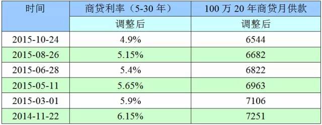 以去年最后的利息調(diào)整日期(2014年11月22日)計算,你2016年負擔(dān)的利率一下子從2015年的6.15%下降到4.9%。今年央行利率5連降,100萬20年商業(yè)貸款的月供每次約減少150元左右。明年的月供款從7251元下降至6544元,每月節(jié)省707元!