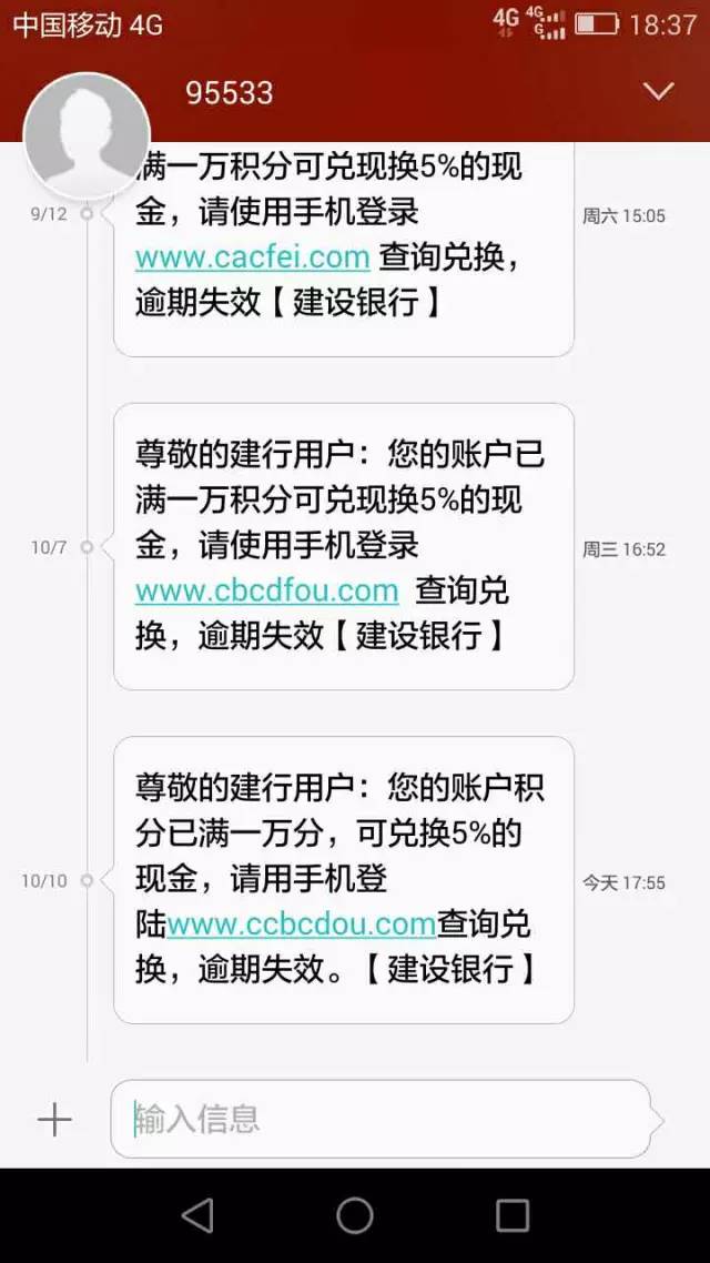 警惕!近期有市民報料稱,自己連續(xù)收到了銀行發(fā)來的短信,說自己可以憑積分兌換現(xiàn)金。短信里提供的鏈接打開后,就是“銀行網(wǎng)站”。