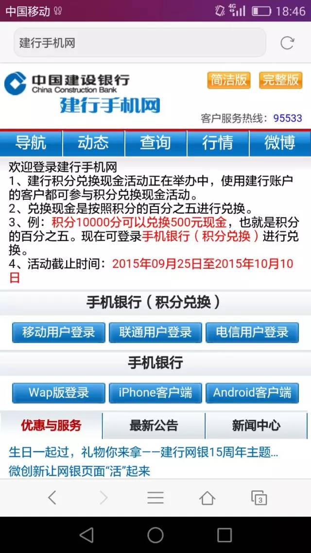 一萬積分兌換500元,簡直是天上掉現(xiàn)金的感覺,于是便有市民心動了,點擊了短信中的鏈接。這時,手機跳轉到了一個上網(wǎng)界面,顯示是“建行手機網(wǎng)”。