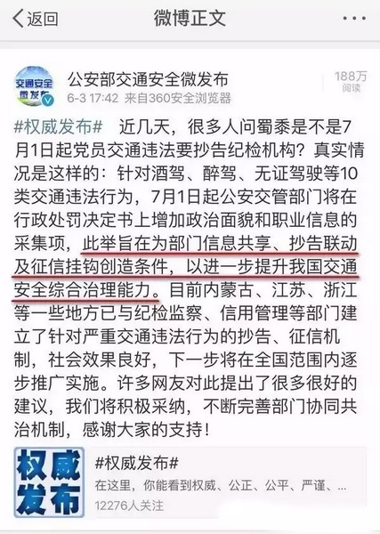 2016年7月1日起,機(jī)動(dòng)車駕駛?cè)藢?shí)施交通違法行為后,公安交通管理部門在對(duì)交通違法作出行政處罰時(shí),被處罰人的政治面貌和職業(yè)信息將被調(diào)查,涉及中共黨員和國(guó)家工作人員的將被通報(bào)紀(jì)檢監(jiān)察機(jī)關(guān)。