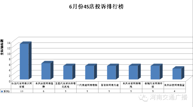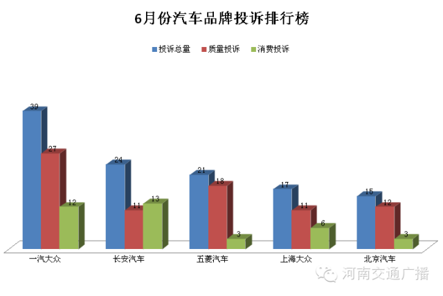 2015年6月份,河南交通廣播《1041維權(quán)直通車(chē)》接到汽車(chē)投訴418起,本次投訴排行榜上海大眾首次退出了“前三甲”,但一汽大眾仍然一馬當(dāng)先。