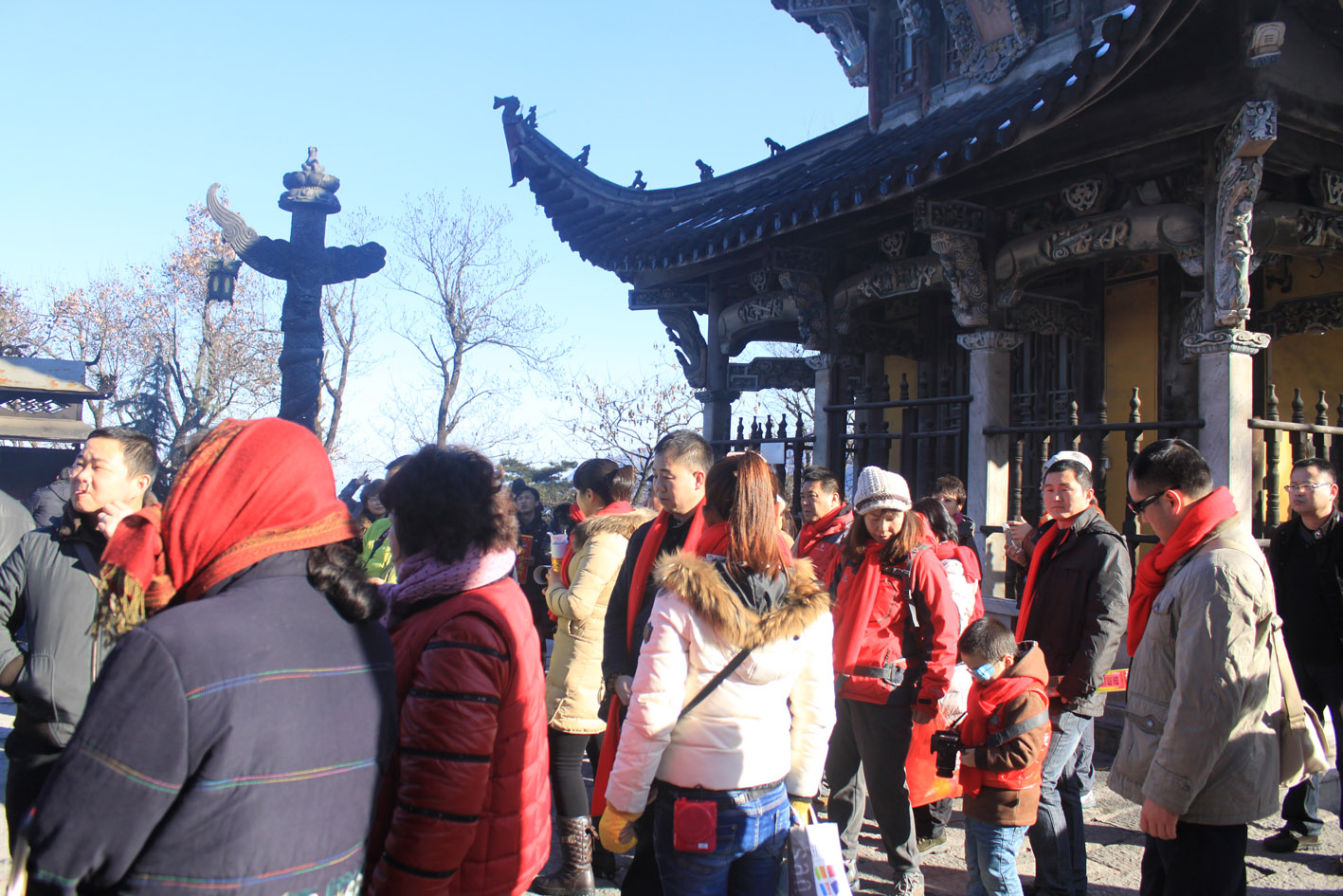 我們的自駕車隊(duì)12月31號(hào)抵達(dá)九華山之前,這里剛剛下過一場(chǎng)雪,湛藍(lán)色的天空、漫山遍野銀裝素裹,明黃色的寺廟在白雪的映襯下別有一番景致。在第一天登百歲宮時(shí),大家相互鼓勵(lì),并不時(shí)調(diào)侃氣氛,讓不少車友第一次感受到了雪中登山的樂趣。