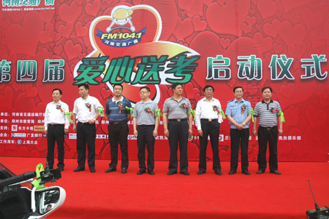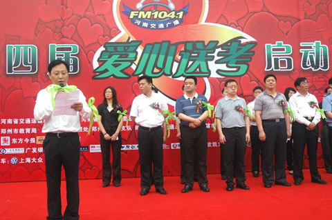 6月4號上午,隨著河南人民廣播電臺總編輯張大寶宣布啟動。河南交通廣播第四屆全省愛心送考大型公益活動正式拉開帷幕。河南省交通運輸廳道路運輸局、河南省公安廳交警總隊、河南人民廣播電臺以及鄭州市教育局、鄭州市交警支隊、鄭州市客運管理處、鄭州市公交總公司等多家單位的領(lǐng)導(dǎo)出席了活動儀式。