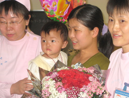 河南省婦幼保健院的醫(yī)護人員歡送康復王然出院