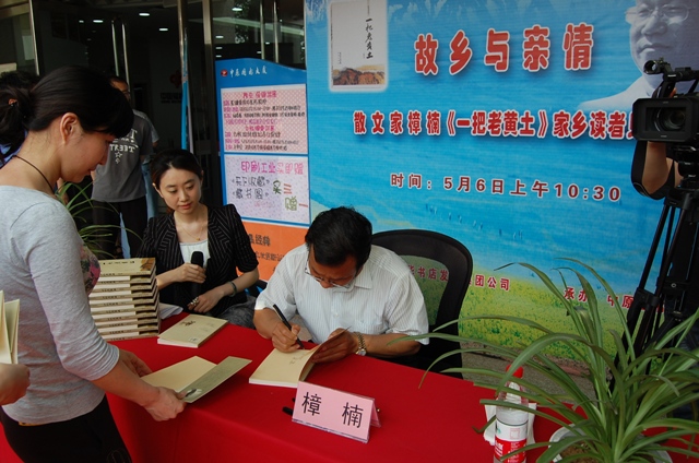 新疆著名散文家樟楠,5月6日在省會(huì)中原圖書大廈舉行讀者見面會(huì),并現(xiàn)場(chǎng)簽售新書《一把老黃土》。樟楠原名張可讓,河南靈寶人,現(xiàn)為新疆自治區(qū)黨委宣傳部副部長(zhǎng)、《宣傳大視野》雜志總編輯。書中,樟楠深情地描繪了故鄉(xiāng)的人和事,用簡(jiǎn)潔的筆法,表達(dá)了作者對(duì)家鄉(xiāng)的一片深情.