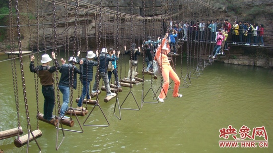 盡管鄭州的天氣忽冷忽熱還時不時的狂風(fēng)大作,但是在這里天氣卻晴朗明媚,溫度也正好適宜外出游玩。當(dāng)然,玩的嗨才是最關(guān)鍵的!景區(qū)內(nèi)除了誰都不會錯過的風(fēng)景名勝外還有很多有趣的娛樂項目:比如過吊索:看起來簡單的吊索其實需要有很好的體力和身體協(xié)調(diào)力,一不留神就可能狼狽的掉入半米深的池水中。還有劃沖鋒舟,非常考驗團(tuán)隊的協(xié)作。不過最好玩的卻是在大巴車上,“樂活”的工作人員們把最自己具特色的電臺節(jié)目“知道不知道”搬上了大巴車,并邀請了電臺的明星主持亞楠來與大家互動,把無聊的旅途變得趣味橫生。