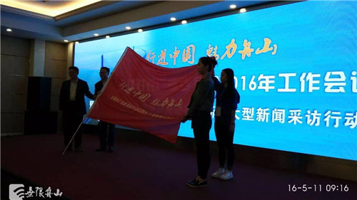 中廣聯(lián)對農(nóng)廣播委員會會長史敏、舟山市委常委、宣傳部部長、統(tǒng)戰(zhàn)部部長忻海平為“行進(jìn)中國 魅力舟山”全國農(nóng)村廣播記者走進(jìn)舟山大型新聞采訪行動授旗。中央人民廣播電臺記者劉旻嚖、舟山新聞廣播記者沈宇曄接旗。