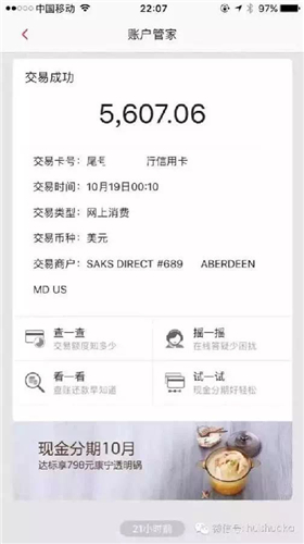 10月19日凌晨,市民王女士被接踵而至的三條信息叫醒,看過(guò)之后她睡意全無(wú),這是三條信用卡的消費(fèi)記錄,記錄顯示自己的招商銀行信用卡共消費(fèi)8035.97美元,按照匯率差不多是54000元左右。