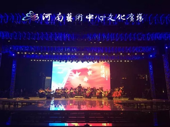 伴隨臺上指揮黃俊博的手勢起,河南愛樂樂團開始演奏交響樂《紅旗頌》。