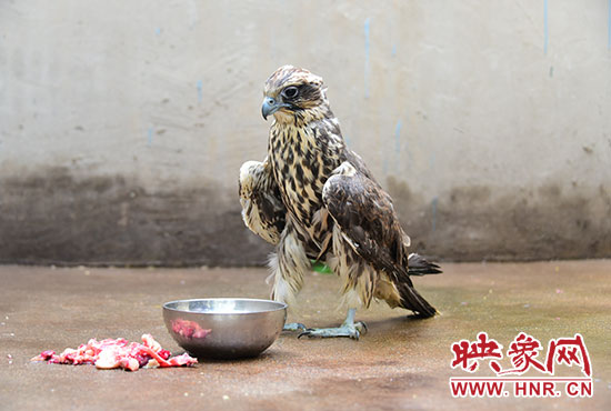 “這是一只獵隼,在我國屬于國家二級重點保護動物。蒙古國政府在2012年決定,將獵隼確定為蒙古國“國鳥”。蒙古國官方數(shù)據(jù)顯示,蒙古國境內(nèi)現(xiàn)存獵隼約6800只。由于它分布在蒙古國和我國的新疆、甘肅以及內(nèi)蒙古等地,而在我們河南沒有分布,因此十分罕見。從它頭頂色絨毛還沒退去就可以看出,它是今年剛孵化出來兩個多月的幼鳥。它的右翅膀第四、第五根飛羽有斷裂,右爪輕微擦傷,另外它患有非常嚴重的腸炎。這只獵隼,應(yīng)該是被人非法飼養(yǎng)后逃逸出來的,由于其野外捕食能力差,饑腸轆轆,體力不支,飛不起來,后被好心村民發(fā)現(xiàn),要不然是不可能逮住的。也多謝這位好心村民,要不然,它極易受到野狗野貓和其他大型猛禽襲擊或者落入不法分子手中牟取暴利?!倍鹃L說。