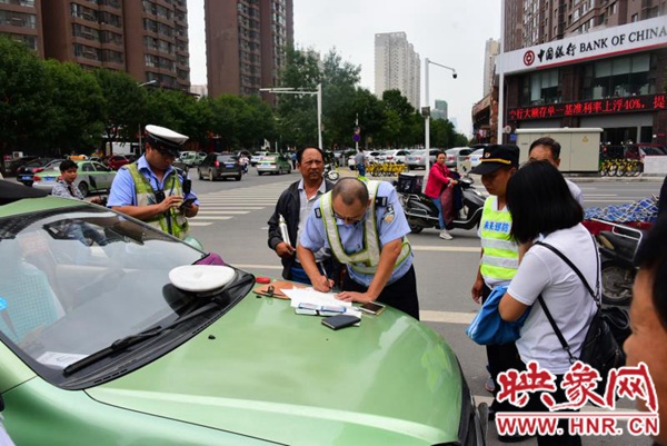 在路口的西南角,停著一輛出租車。鄭州市交警四大隊兩名民警正向雙方當(dāng)事人詢問情況。