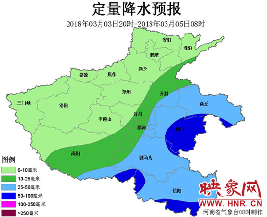 此次過(guò)程全省大部分地區(qū)有小到中雨,主要降水時(shí)段出現(xiàn)在3日夜里-4日白天,其中東部、南部有大雨,局部暴雨,并伴有雷電。過(guò)程雨量豫東、豫南達(dá)20-50毫米,其它地區(qū)5~20毫米,最大雨量可達(dá)10-20毫米/小時(shí)。另外,4日全省還會(huì)有4-5級(jí)偏北風(fēng),最高氣溫較前期下降7-9℃。