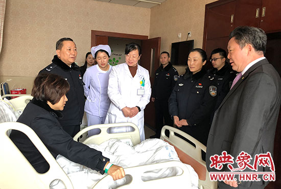 鄭東分局局長張予西等領(lǐng)導(dǎo)同志看望在病床上的宋穎穎