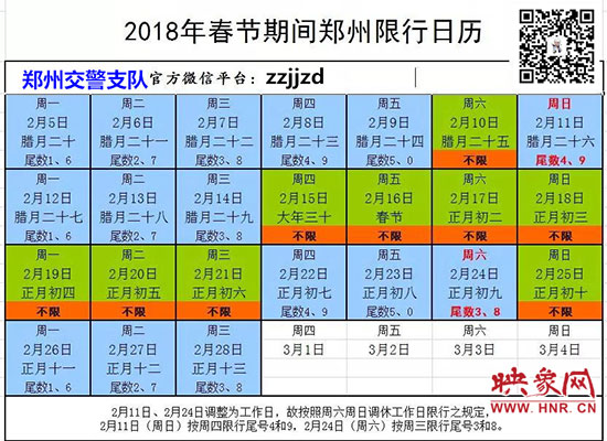 映象網(wǎng)訊(記者 秦雯)2018年春節(jié)長假從2月15日開始至2月21日結(jié)束,共7天,春節(jié)將至,為了確保在市民人流、車流、物流最密集的時(shí)段可以安全出行。2月5日,記者從鄭州市交警支隊(duì)了解到:2月15日至2月21日春節(jié)七天長假期間,鄭州市區(qū)三環(huán)以內(nèi)所有機(jī)動車尾號不限行,但2月11日(星期日)、2月24日(星期六)上班,因法定節(jié)假日放假調(diào)休而調(diào)整為上班的周六、周日,按對應(yīng)調(diào)休的工作日限行,因此2月11日(周日)按周四限行規(guī)定,限行尾號4和9;2月24日(周六)按周三限行規(guī)定,限行尾號3和8。