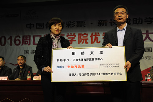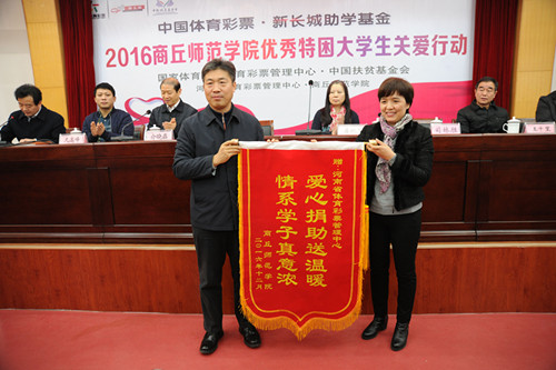 2016年12月7日、8日,中國(guó)體育彩票品牌公益項(xiàng)目“中國(guó)體育彩票新長(zhǎng)城助學(xué)基金”2016年捐贈(zèng)儀式分別在商丘師范學(xué)院和周口師范學(xué)院舉行。據(jù)悉,通過(guò)此次捐贈(zèng)活動(dòng),河南省體育彩票管理中心共向兩個(gè)學(xué)校來(lái)自全國(guó)14省區(qū)的120名優(yōu)秀貧困大學(xué)生每人捐助5000元,幫助他們和他們的家庭,減輕學(xué)習(xí)生活中的經(jīng)濟(jì)負(fù)擔(dān)。