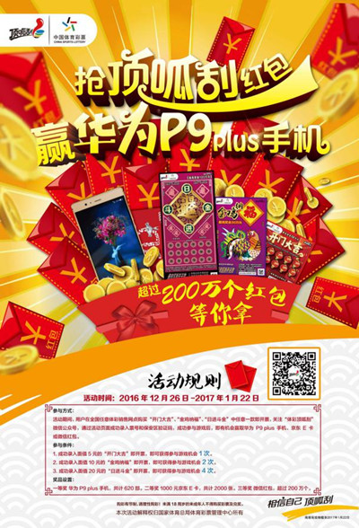 值此新年來臨之際,體彩頂呱刮為回饋彩民朋友一年來的支持,以及對體彩頂呱刮的關注,在新年期間開展“搶頂呱刮紅包,中華為P9plus手機”活動。