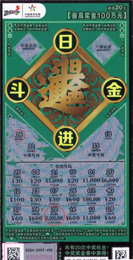 “日進(jìn)斗金”面值20元,共有三個游戲。游戲一和游戲二,刮開覆蓋膜,如果出現(xiàn)金額標(biāo)志,即中得該金額;游戲三:刮開覆蓋膜,如果你的號碼中任意一個號碼與中獎號碼之一相同,即中得該號碼下方所示的金額;如果出現(xiàn)銅錢標(biāo)志,即中得該標(biāo)志下方所示金額的3倍;如果出現(xiàn)元寶標(biāo)志,即中得該標(biāo)志下方所示金額的5倍。