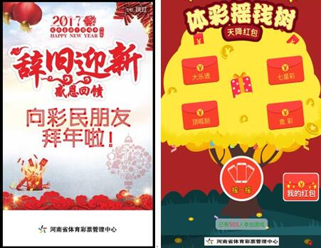 [摘要] 活動期間微信搜索“河南體彩”,先添加關注,再在對話框中回復關鍵字“搖錢”,即可按提示進入游戲,搖動手機即有機會搖取“現(xiàn)金紅包”,先到先得,搶完為止。