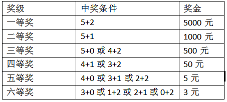 一等獎(jiǎng):投注號(hào)碼與“樂善碼”的5個(gè)前區(qū)號(hào)碼(順序不限,下同)和2個(gè)后區(qū)號(hào)碼(順序不限,下同)相同,即中獎(jiǎng),獎(jiǎng)金為5000元;