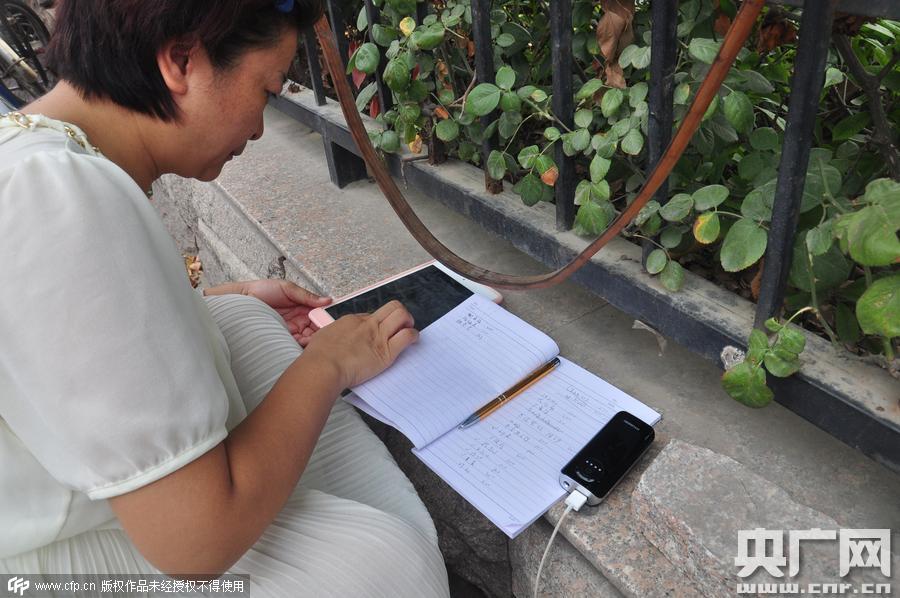 傘下,一名拿著平板電腦蹲在地上的女士在幫李俊強進(jìn)行微信募捐。這名愛心人士叫左微,是一集團(tuán)公司的負(fù)責(zé)人,21日看到東方今報“賣水爸爸”的報道后,她在微信群里發(fā)起“一瓶水”公益,22日募集3200元,23日上午募集5600多元。