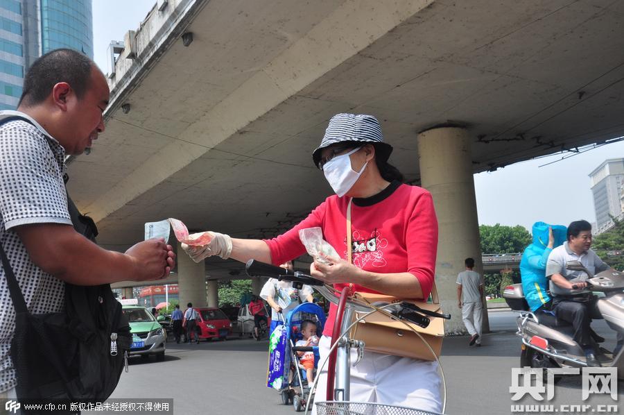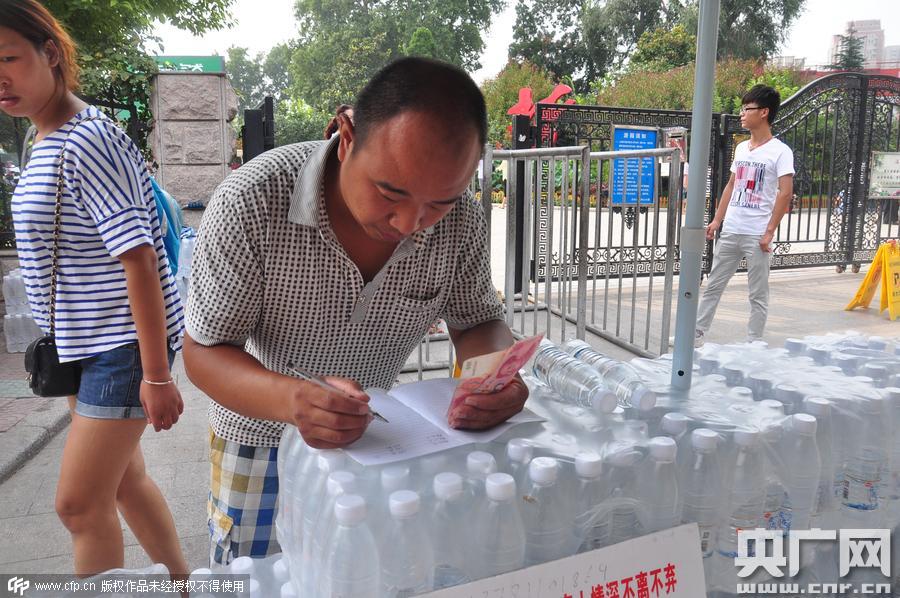 2015年8月23日,河南鄭州,“賣水爸爸”李俊強街頭籌善款給女兒治病。 市民捐款
