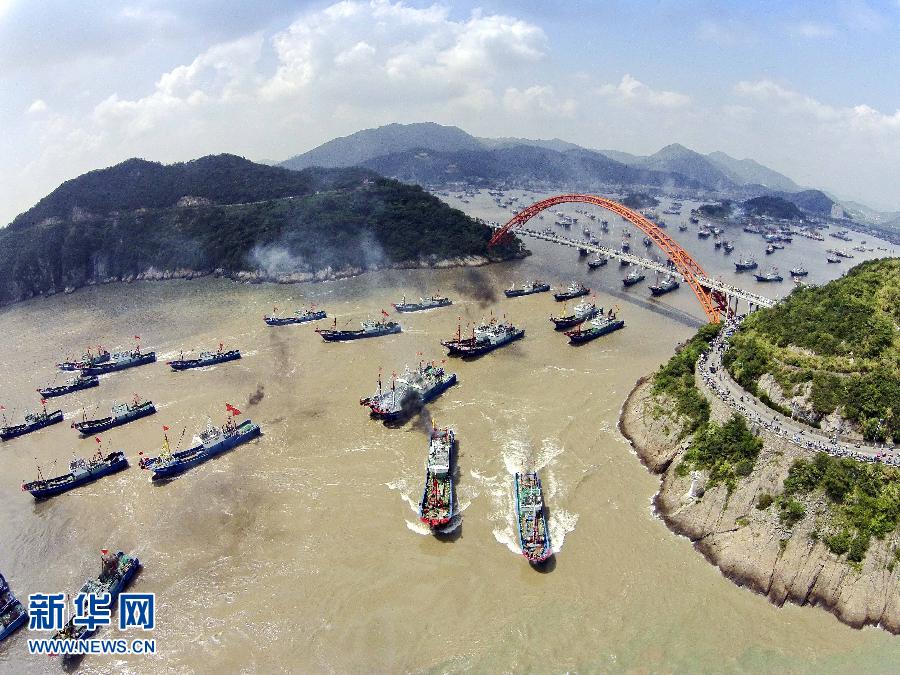9月16日,浙江省舟山市沈家門漁港的漁船出港經(jīng)過朱家尖大橋開赴漁場(chǎng)。當(dāng)日,為期3個(gè)半月的東海伏季休漁結(jié)束,眾多漁船劈波斬浪,開往漁場(chǎng)。 新華社發(fā)(華志波 攝)