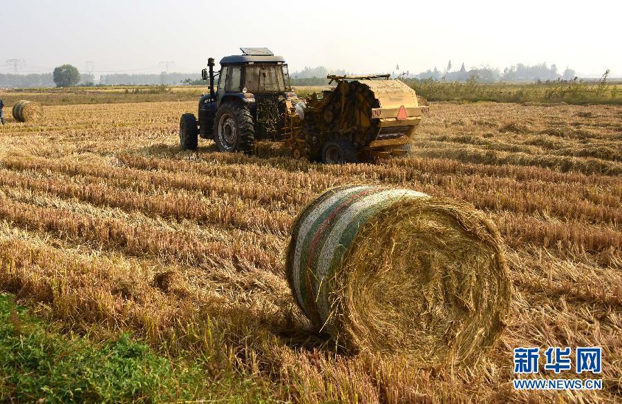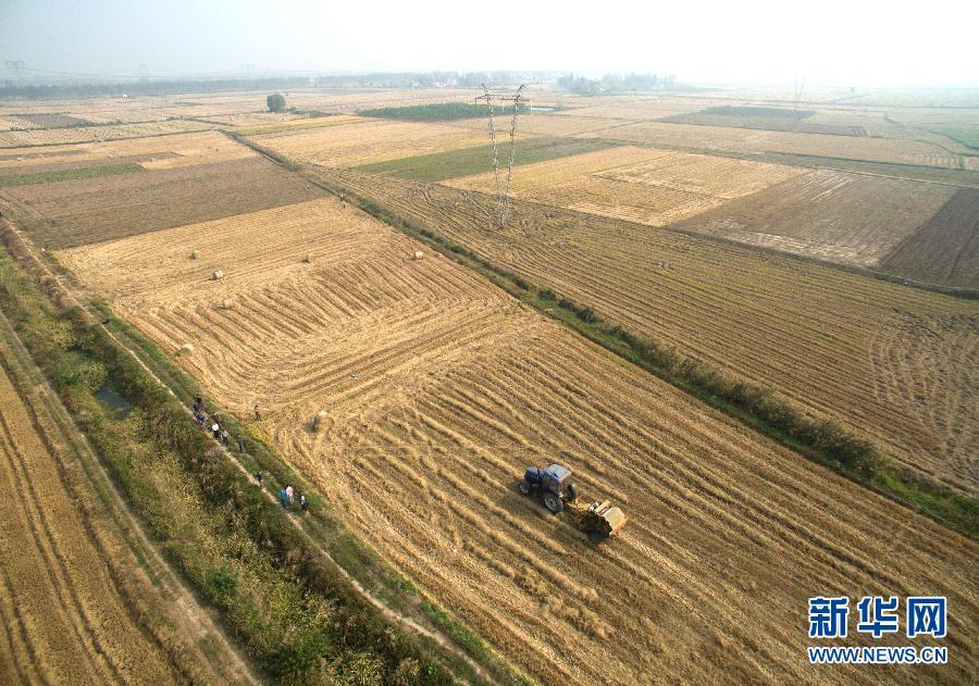 湖北省荊州市的一處農(nóng)田在開展綜合利用秸稈收儲作業(yè)(10月22日攝)。