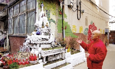 北側(cè)居民樓東南拐角被他建了一座假山,假山2米多高,山頂鑲嵌酒瓶作為裝飾,山腰處則安裝了寶塔等物,他稱假山為“福山”,進(jìn)入小區(qū)不但要感受居民的好客和熱情, 還要感覺到滿滿的幸福。