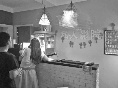 “影院的小包間適合2~4人,大的最多可坐8人。”晚上10點,所設(shè)5個包間已全部滿員,包間都為不帶窗木門,均可反鎖。“候影廳”內(nèi)設(shè)置有新片推介板、爆米花機和各式酒水,不少年輕男女正排隊等待觀影。