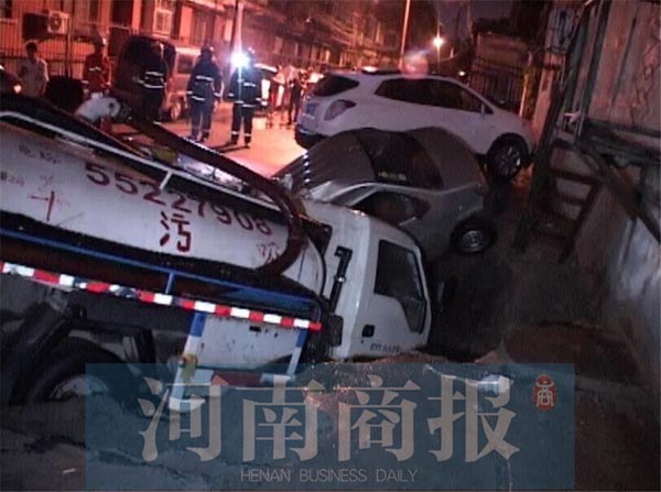 鄭州新鄭路凌晨現(xiàn)一深坑 停在路邊的兩車掉入坑中