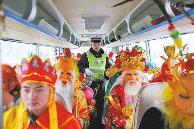 經(jīng)過省交警總隊(duì)核實(shí),濟(jì)源市交警支隊(duì)民警在執(zhí)勤中確實(shí)遇到此事。大河報記者隨后聯(lián)系到濟(jì)源市交警支隊(duì)宣傳科相關(guān)人士,他講述了這個事情。2月7日,濟(jì)源交警在濟(jì)源市207國道執(zhí)法服務(wù)站執(zhí)勤時,在檢查點(diǎn)攔下了“孫悟空”駕駛的一輛大巴車,令交警想不到的是,車上居然還坐著一車《西游記》中的“神仙妖怪”,其中有“唐僧師徒”、“財神”、“土地神”、“小鉆風(fēng)”、“牛魔王”、“獅子精”、“白骨精”等,“當(dāng)時我們民警檢查時感覺自己‘穿越’了”。