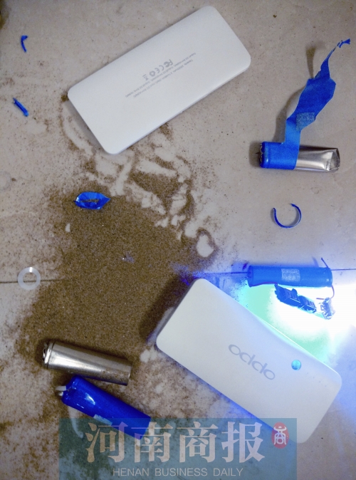 離開(kāi)后,河南商報(bào)記者將充電寶拆開(kāi),看到充電寶中部分蓄電池與其他電池獨(dú)立分開(kāi),根本沒(méi)有導(dǎo)線(xiàn),而沒(méi)有導(dǎo)線(xiàn)的電池里,裝滿(mǎn)了沙子。“oppo”充電寶中共有5節(jié)電池,有2節(jié)與電板通過(guò)導(dǎo)線(xiàn)相連,剩下光禿禿的3節(jié)電池“自成一派”。用錘子敲碎2節(jié),從電池里流出了細(xì)沙。