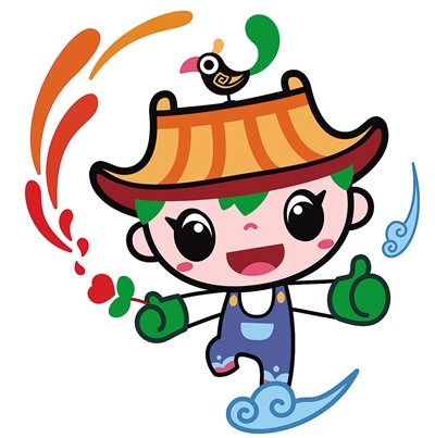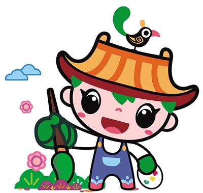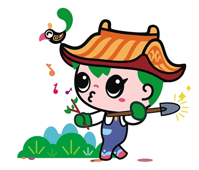 吉祥物“園寶”整體形象是一位朝氣蓬勃的小園丁,造型以傳統(tǒng)元素融匯時(shí)尚風(fēng)格,集建筑、山水、植物、動(dòng)物、文化藝術(shù)等園林要素于一身;頭頂?shù)拿弊有嗡浦惺絺鹘y(tǒng)建筑屋頂,象征中國(guó)古典園林建筑,代表“園”;蔥郁的頭發(fā)和雙手,胸部、腿部圖案、色彩等,象征山水花木,代表“林”;身體五彩繽紛,臉部笑容明媚親和,右手豎起點(diǎn)贊的大拇指;左手執(zhí)新綠萌發(fā)的葉芽,象征園林工作者辛勤耕耘,讓華夏大地永葆綠水青山。