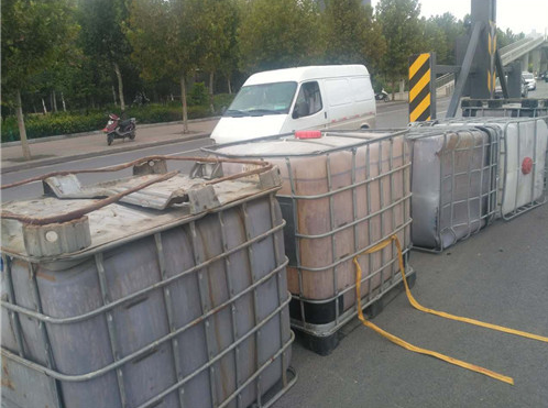 據(jù)貨車司機(jī)介紹,他車上拉的這些邊長(zhǎng)約1米的方形大桶是裝醬油用的,當(dāng)天拉著這些空桶從新鄭來到鄭州,因?qū)β窙r不熟,不知道此處上橋口有3米的限高桿,直到上橋時(shí)撞上限高桿后,才知道貨車不讓上三環(huán)立交橋。