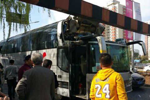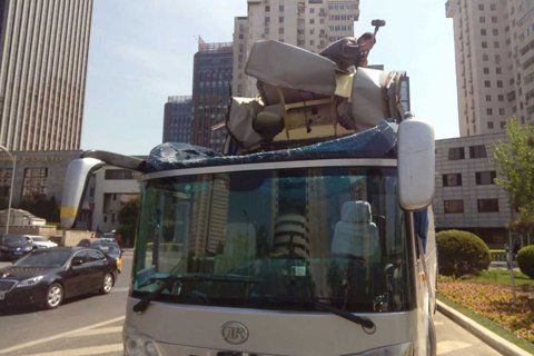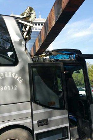 北京大巴車撞上限高桿 車頂凹陷無(wú)傷亡